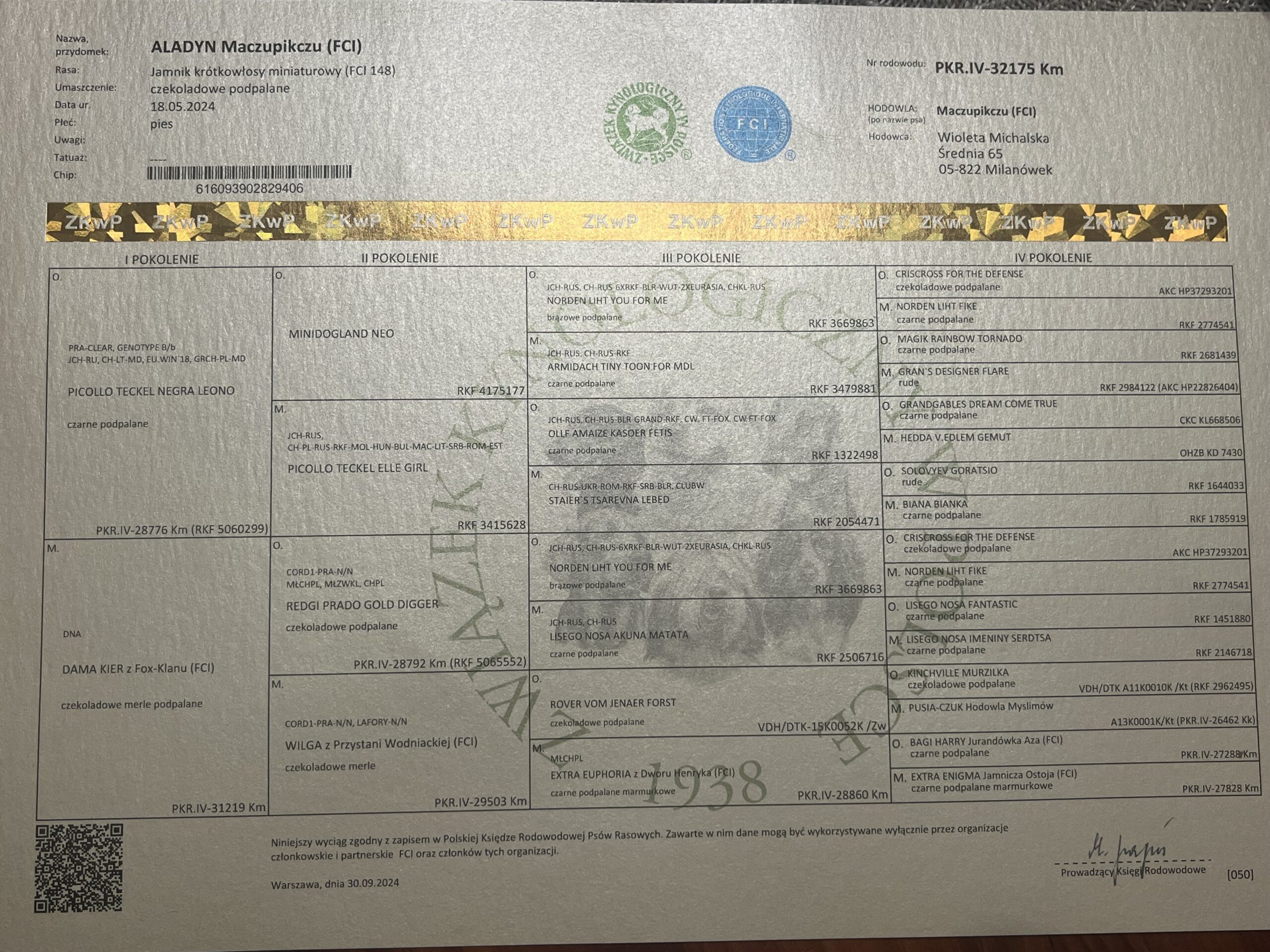 W naszej hodowli mamy młodego psa o ogromnym potencjale – Aladyna Maczupikczu. Pomimo młodego wieku, ma już na swoim koncie imponujące osiągnięcia: dwukrotnie otrzymał tytuł Najlepszego Szczenięcia w Rasie, trzykrotnie Zwycięstwo Młodzieży, CACIB-Junior, Nominację na Crufts oraz Zwycięstwo Rasy. To pies o świetnym eksterierze, pewnym ruchu i zrównoważonym charakterze. Z każdym występem pokazuje, że ma przed sobą obiecującą przyszłość zarówno wystawową, jak i hodowlaną.